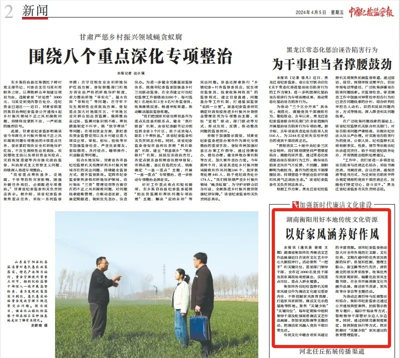 传统文化中蕴含着家风建设的丰富资源。该市纪委监委推动加大对全市各地历史文献、文化经典、文物古迹中的优秀家风资源的保护、修复和挖掘,整理王船山、彭玉麟等古代先贤、清官廉吏的修身齐家故事,收集优秀传统家规家训,编纂优良家风主题书籍,在全市开展清廉文化书画作品展、廉洁家书共读、家风故事分享会等主题活动。