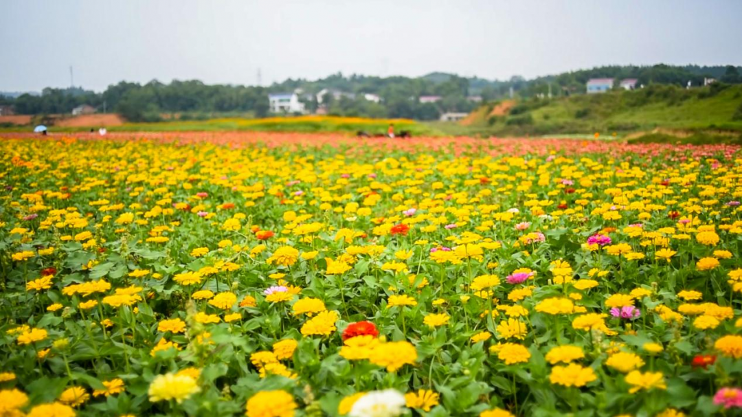 石杨花海大片大片的硫磺菊、波斯菊、百日草、向日葵等随风摇曳,美轮美奂。