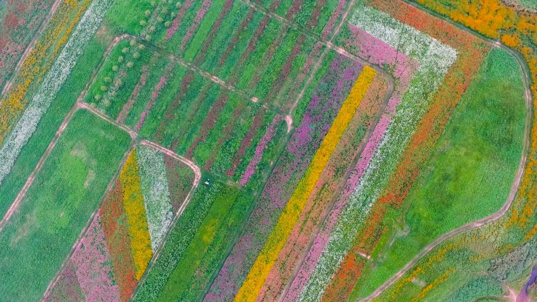 衡东县洣水国家湿地公园石杨花海位于衡东县新塘镇石杨村。在河滩湿地上,繁花盛开,杨柳依依,池杉葱茏,美不胜收。图为衡东县新塘镇石杨花海高空俯瞰全景。(衡东县新塘镇文峰社区李军摄)