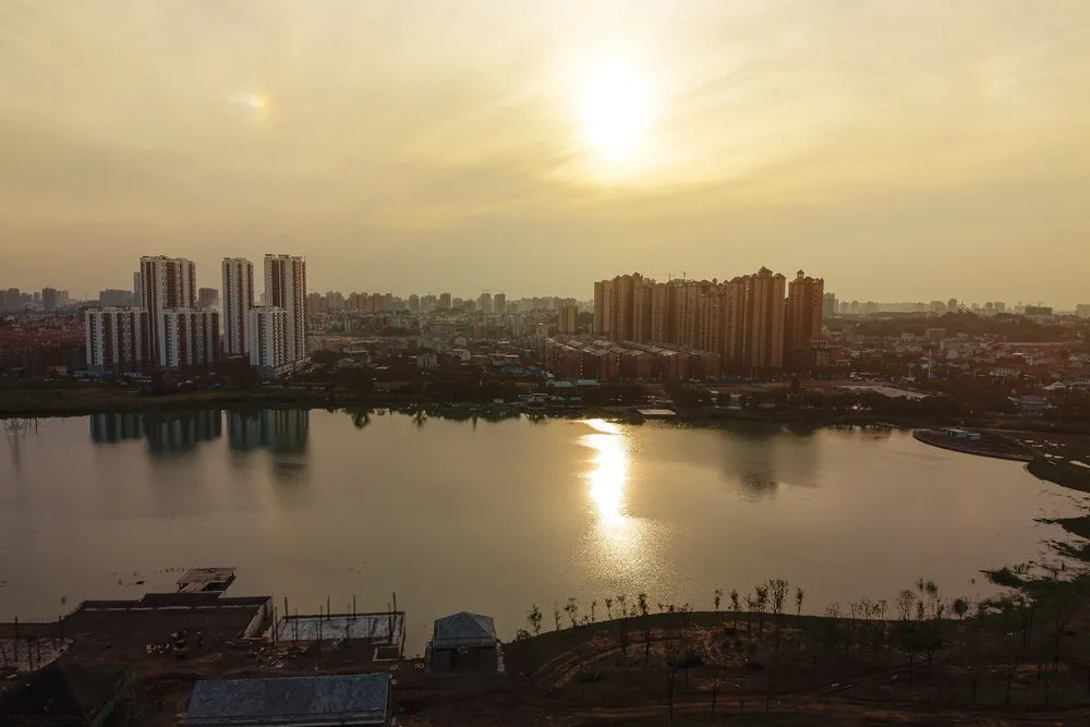 落日映衬的天空、波光粼粼的湖面、绕湖而建的高楼,曾经的渔舟唱晚正华丽变身成最美城市水上公园。图为珠晖区酃湖乡酃湖公园日落风景。(珠晖区酃湖乡雁东湖社区 吴忠澄摄)