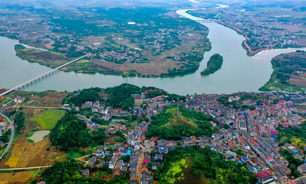 衡东县草市镇地处洣水、永乐江、草市河汇合处,明清两个朝代都曾设巡检司,以巡检司和练兵的草坪而名草司;自明朝开埠以来,由于得天独厚的地理位置和水陆交通条件,草市镇逐步形成集市墟场;清咸丰三年(公元1853年)更名草市,2015年入选首批“湖南最美古村镇古民居”。图为衡东县草市镇三泾合流高空俯瞰全景。(衡东县草市镇灵山社区 赵伟军摄)